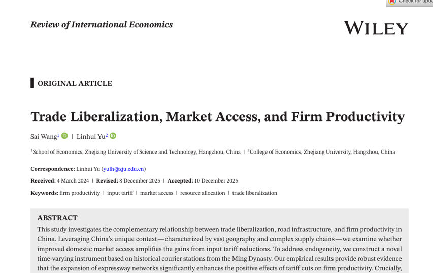 近日,经济学院开放型经济学科团队与合作者撰写的学术论文《Trade Liberalization, Market Access, and Firm Productivity》(点击阅读全文) ,在国际经济学领域权威期刊《Review of International Economics》上发表。经济学院青年教师王赛为第一作者,浙江科技大学为第一完成单位。