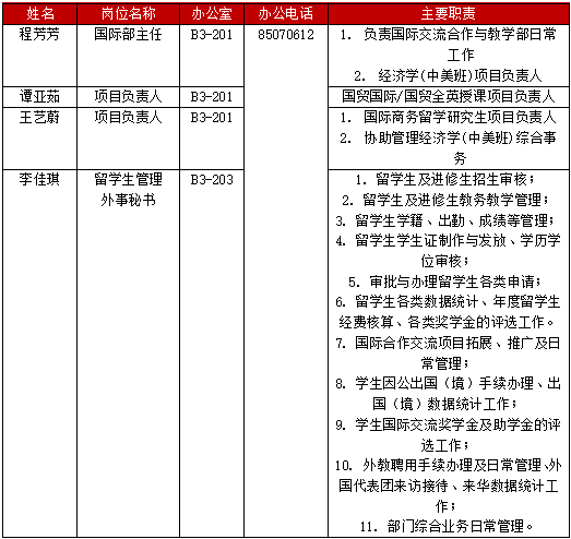 系所中心 首页 学院概况 系所中心 正文 国际交流合作部 国际交流合作与教学部主要负责本院的国际交流合作项目的拓展、推广和日常管理等事务,并负责经济学(中美合作办学)、国际经济与贸易(国际班)、国际经济与贸易(全英文授课班)三个国际化本科专业和国际商务留学研究生专业的教学任务。现有全英文授课教师16人,其中具有博士学位教师比例约70%,具有海外留学或访学背景的教师比例100%。