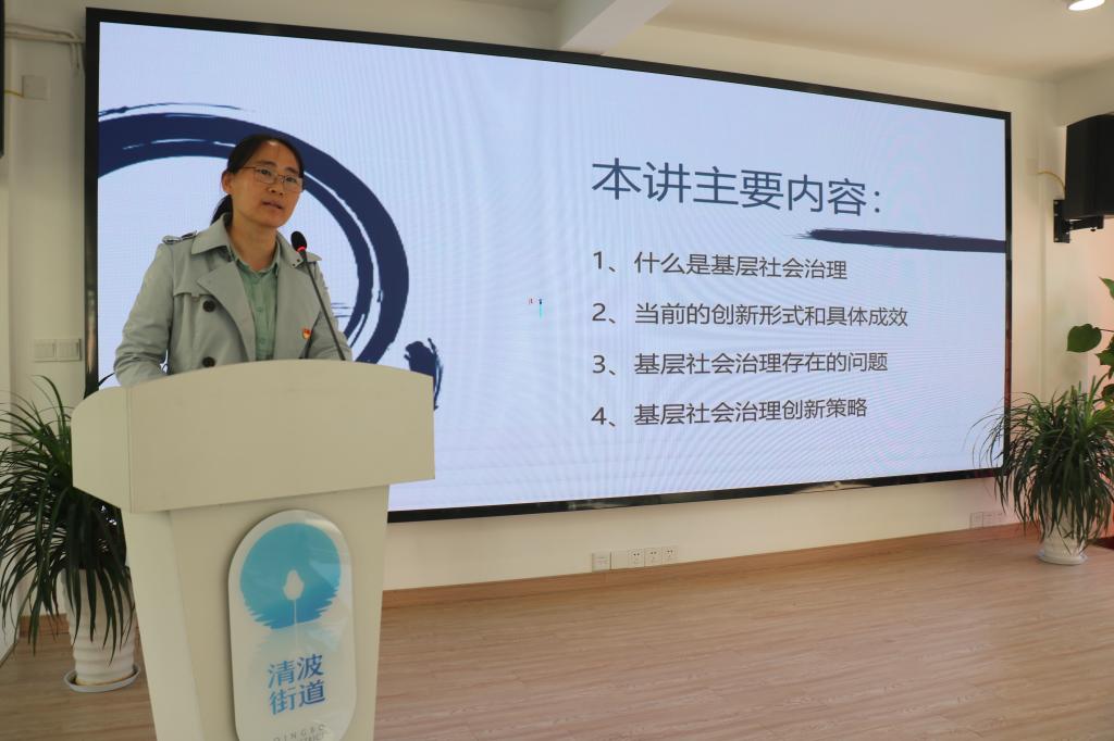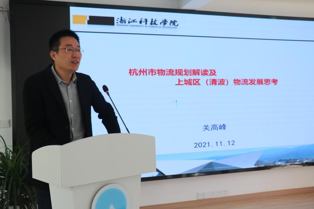 校地企党建共建联盟启动仪式上,经管学院党委书记黎东升与清波街道党工委书记蒋晓斌、浙江省皮革塑料有限公司支部书记葛颖共同为“校地企党建联盟”揭牌;揭牌仪式后,经管学院关高峰副教授和于兰华副教授分别以《杭州市物流规划解读及上城区物流发展思考》和《新时代基层社会治理实践与创新思考》为题作了专题报告。