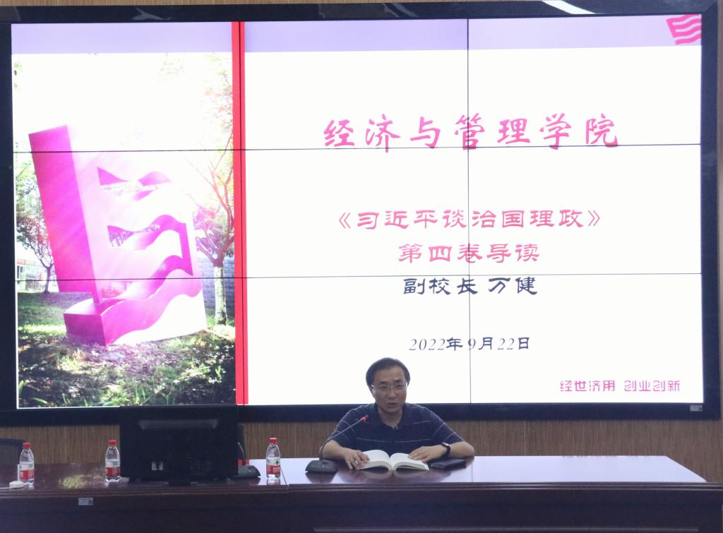 党建信息 首页 新闻中心 党建信息 正文 经管学院开展《习近平谈治国理政》第四卷专题学习会 9月22日,经管学院召开《习近平谈治国理政》第四卷专题学习会,邀请副校长万健作专题报告,学院党委书记黎东升主持会议,系(部)负责人、党支部书记和全体行政教职工参会。 学习会上,万校长重点围绕《习近平谈治国理政》第四卷中不断做强做优做大我国数字经济的专题进行导学,运用大量实例和数据,全面深入剖析了对习近平总书记谈数字经济的学习心得体会,并对经管学院的学科建设给予了针对性的指导,对学院进一步把思想和行动统一到习近平新时代中国特色社会主义思想和习近平总书记重要讲话精神上具有重大引导作用。 学习会后,黎书记对于学院下一步学习工作强调以下四点:一要进一步深刻领会“两个确立”的决定性意义,坚决做到“两个维护”;二要进一步把学习《习近平谈治国理政》第四卷的成效转化到日常教学、科研及教学研究和数字经济等学科建设谋划之中,力争在新一轮学科点申报工作早谋划、早行动和早成功;三要进一步发挥党员教师的示范带动作用;四要进一步为党的二十大胜利召开营造良好的氛围。 下一步,各党支部和党员要以支部主题党日、个人自学等多种形式学习《习近平谈治国理政》第四卷,真正用党的创新理论武装头脑、指导实践、推动工作,在学懂弄通做实上下功夫,切实把学习成果转化为践行“八八战略”,投身“两个先行”,为学校“一培育两攻坚”重点工作目标作出经管学院的贡献。