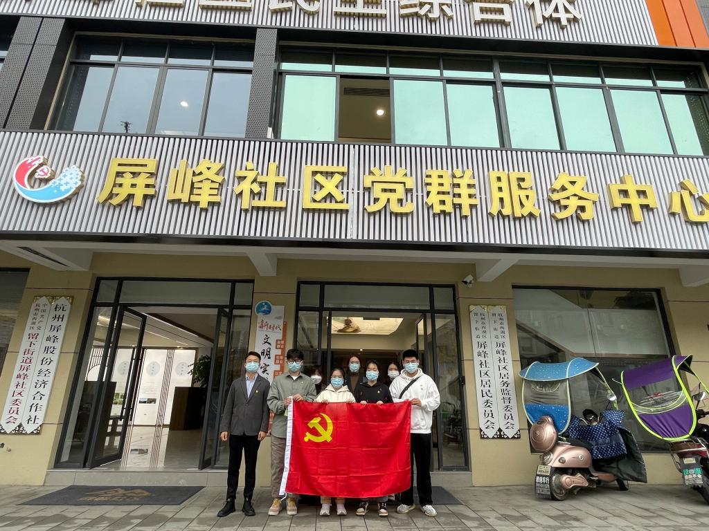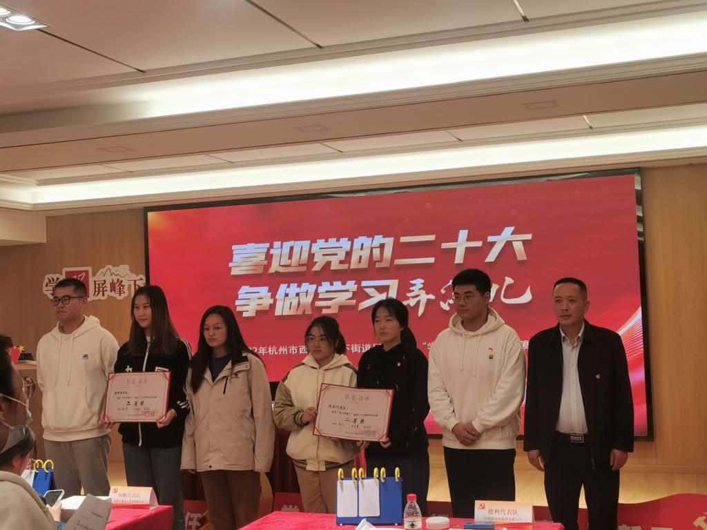 20221122日下午,由中共杭州市西湖区留下街道屏峰社区委员会与中共浙江工业大学计算机科学与技术学院委员会共同举办的党建联建仪式暨“党的二十大”理论知识竞赛在屏峰社区党群服务中心举办,除承办单位外,还有高校代表队、企业代表队参与竞赛,浙江科技学院经济与管理学院学生经济学(中美)党支部在支部书记李寒滇的带领下,派出 “亮剑” 代表队参赛,队伍由简凡、朱李萱、林芳竹三名同学组成,由刘雯洁、汪婉婉、应文豪、朱柯婷组成后援团。