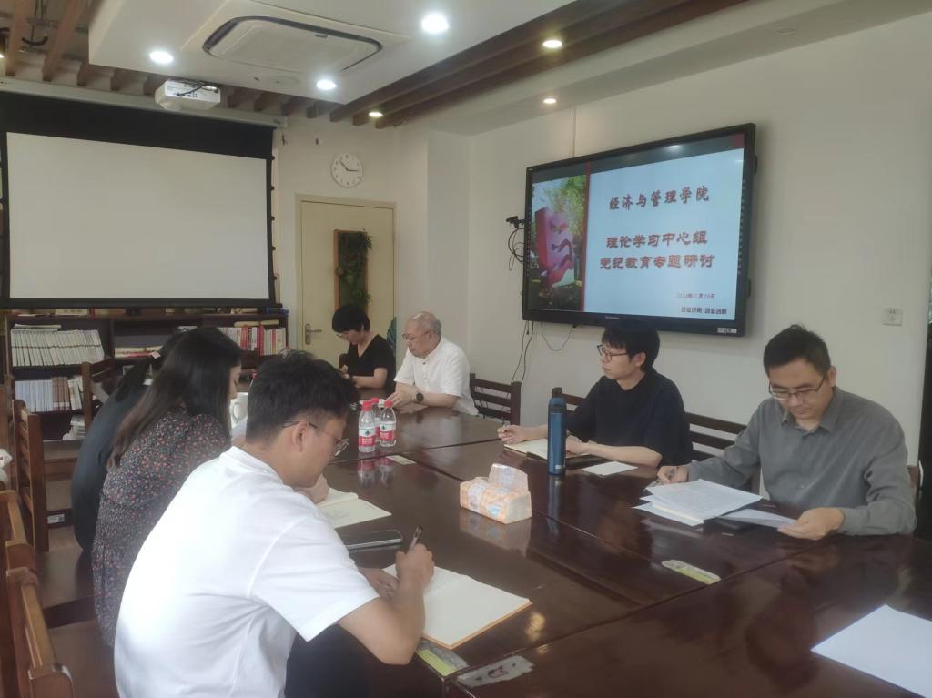 党建信息 首页 新闻中心 党建信息 正文 经管学院党委理论学习中心组召开党纪专题学习会 5月20日,经管学院党委理论学习中心组召开党纪专题学习会。重点围绕修订后的《中国共产党纪律处分条例》开展学习研讨。学院党委理论学习中心组成员参加会议,院长董颖、本科生支部书记李寒滇、研究生支部书记杨菲列席参加会议。 会议强调,牢牢把握党纪学习教育的总要求,坚持学思用贯通,不断增强政治定力、纪律定力、道德定力,为高等教育事业高质量发展提供坚强纪律保障。要用深悟践行推动党纪教育。一是原原本本学习《条例》,逐章逐条学习研讨。二是坚持严管厚爱结合,班子成员间、班子成员与普通党员、班子成员与党外知识分子谈心谈话全覆盖,及时进行个别廉政提醒。三是召开警示教育会,注重用身边人身边事开展警示教育,让党员、干部、教师受警醒、明底线、知敬畏。四是结合学院工作实践,制作廉政风险防控清单,识别岗位风险点、评估风险等级、制定防控措施、落实防控责任、定期评估和调整。 会上,与会成员结合自身工作实际,交流学习体会。