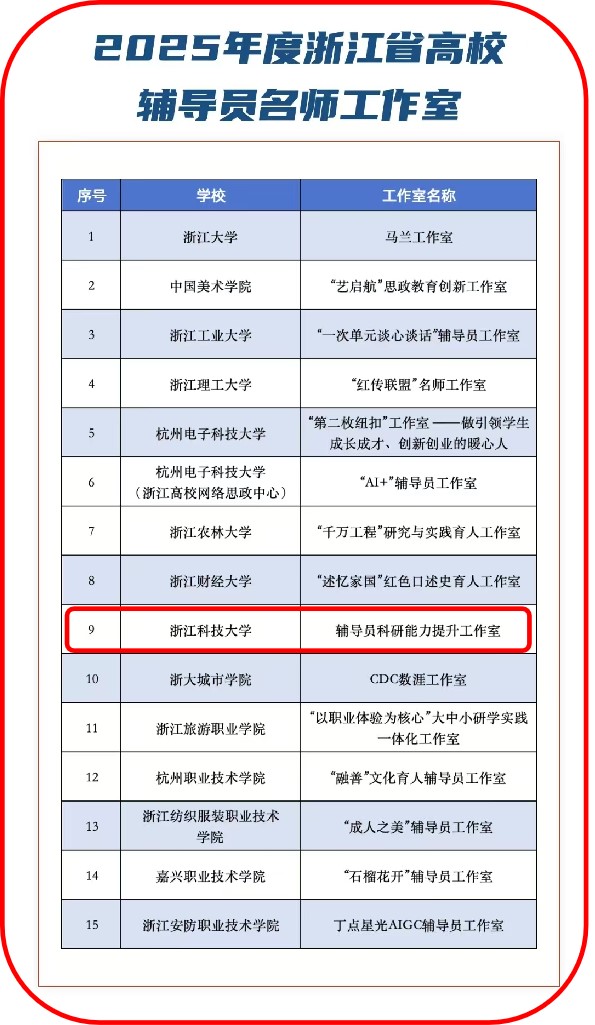 近日,2025年度浙江省高校思想政治工作质量提升综合改革与精品建设项目立项结果公布,学院范俊强老师牵头的辅导员科研能力提升工作室入选浙江省辅导员名师工作室。据悉,这是我校首次获得的浙江省辅导员名师工作室。