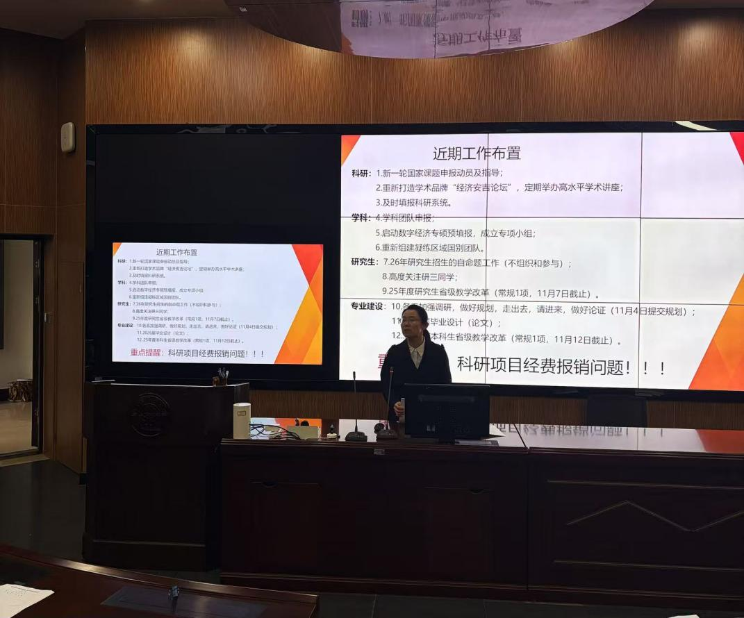 学院副院长(主持工作)翁异静对学院工作进行了部署,她围绕学校2025年高质量发展绩效考核指标,对新一轮国家课题申报动员及指导、学科团队申报、研究生省级教学改革、专业论证规划等工作进行了详细动员和布置,她要求,学院全体教职工要统一思想,凝心聚力,聚焦学科、科研和专业建设等持续发力,共同绘好学院“十五五”发展蓝图。